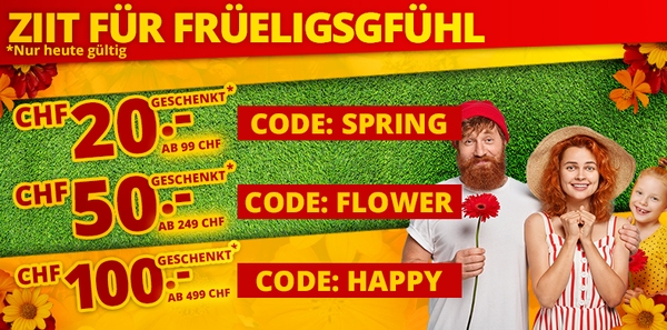 *Gültig nur am 27.02.2022, einmal pro Person. Die Einkaufsgutscheine gelten für alle Artikel im VEDIA Shop www.vedia.ch, inkl. reduzierter Artikel. Barablöse, Kontogutschrift oder Kombination mit anderen Aktionen ist nicht möglich. Versandkosten und Transportzuschläge sowie die Versicherungsgebühr sind vom Gutschein ausgeschlossen. Bei der Bestellung geben Sie bitte an: Gutscheincode SPRING für den Gutschein im Wert von CHF 20, FLOWER für den Gutschein im Wert von CHF 50 und HAPPY für den Gutschein im Wert von CHF 100. Die Mindestkaufwerte (=Wert der behaltenen Ware und bezahlten Ware) betragen: CHF 99 für den CHF 20-Gutschein, CHF 249 für den CHF 50-Gutschein und CHF 499 für den CHF 100-Gutschein. Bei Retournierung oder Stornierung aller bestellten Artikel verfallen die Gutscheine. Die Gutscheine gelten nur für Onlinebestellungen auf www.vedia.ch.