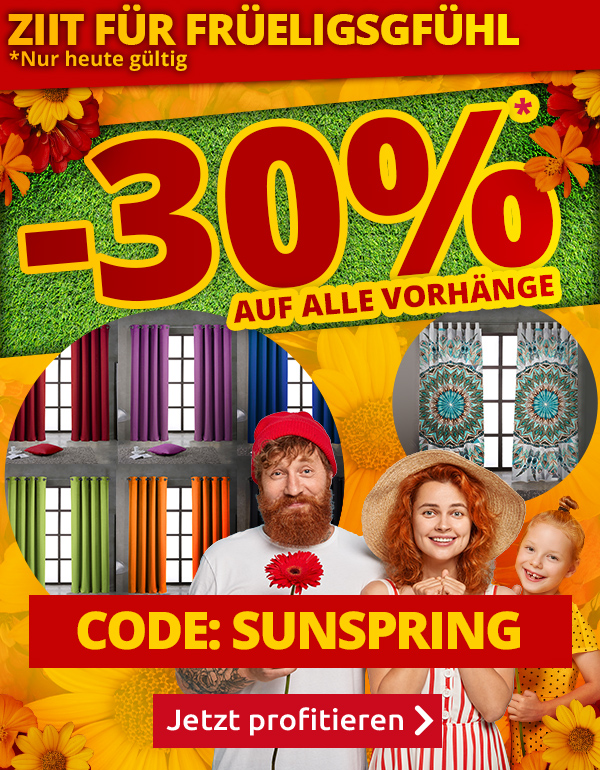 *Gültig nur am 13.03.2022, einmal pro Person einlösbar: 30% Rabatt auf alle Artikel der Rubrik «Vorhänge» im VEDIA Shop www.vedia.ch, inkl. reduzierter Artikel. Barablöse, Kontogutschrift oder eine Kombination mit anderen Aktionen ist nicht möglich. Versandkosten und Transportzuschläge sowie die Versicherungsgebühr sind vom Rabatt ausgeschlossen. Bitte Rabattcode SUNSPRING bei der Bestellung eingeben. Bei Retournierung oder Stornierung aller bestellten Artikel verfällt der Rabatt. Der Rabatt gilt nur für Online-Bestellungen auf www.vedia.ch.