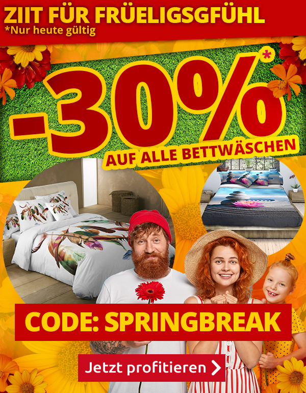 *Gültig nur am 06.03.2022, einmal pro Person einlösbar: 30% Rabatt auf alle Artikel der Rubrik «Bettwäsche» im VEDIA Shop www.vedia.ch, inkl. reduzierter Artikel. Barablöse, Kontogutschrift oder eine Kombination mit anderen Aktionen ist nicht möglich. Versandkosten und Transportzuschläge sowie die Versicherungsgebühr sind vom Rabatt ausgeschlossen. Bitte Rabattcode SPRINGBREAK bei der Bestellung eingeben. Bei Retournierung oder Stornierung aller bestellten Artikel verfällt der Rabatt. Der Rabatt gilt nur für Online-Bestellungen auf www.vedia.ch.