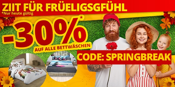 *Gültig nur am 06.03.2022, einmal pro Person einlösbar: 30% Rabatt auf alle Artikel der Rubrik «Bettwäsche» im VEDIA Shop www.vedia.ch, inkl. reduzierter Artikel. Barablöse, Kontogutschrift oder eine Kombination mit anderen Aktionen ist nicht möglich. Versandkosten und Transportzuschläge sowie die Versicherungsgebühr sind vom Rabatt ausgeschlossen. Bitte Rabattcode SPRINGBREAK bei der Bestellung eingeben. Bei Retournierung oder Stornierung aller bestellten Artikel verfällt der Rabatt. Der Rabatt gilt nur für Online-Bestellungen auf www.vedia.ch.