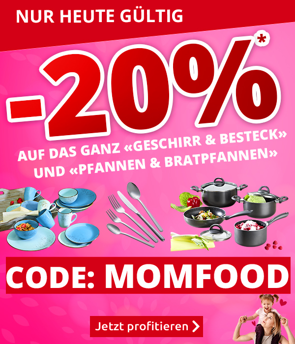 *Gültig nur am 07.05.2022, einmal pro Person einlösbar: 20 % Rabatt auf alle Artikel der Rubriken «Geschirr & Besteck» und «Pfannen & Bratpfannen» im VEDIA Shop www.vedia.ch, inkl. reduzierter Artikel. Barablöse, Kontogutschrift oder eine Kombination mit anderen Aktionen ist nicht möglich. Versandkosten und Transportzuschläge sowie die Versicherungsgebühr sind vom Rabatt ausgeschlossen. Bitte Rabattcode MOMFOOD bei der Bestellung eingeben. Bei Retournierung oder Stornierung aller bestellten Artikel verfällt der Rabatt. Der Rabatt gilt nur für Online-Bestellungen auf www.vedia.ch.