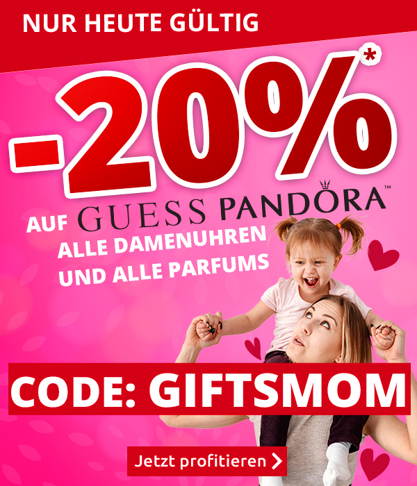 *Gültig am 02.05.2022, einmal pro Person einlösbar: 20 % Rabatt auf alle Artikel der Rubriken «GUESS», «Pandora», «Damenuhren» und «Parfums» im VEDIA Shop www.vedia.ch, inkl. reduzierter Artikel. Barablöse, Kontogutschrift oder eine Kombination mit anderen Aktionen ist nicht möglich. Versandkosten und Transportzuschläge sowie die Versicherungsgebühr sind vom Rabatt ausgeschlossen. Bitte Rabattcode GIFTSMOM bei der Bestellung eingeben. Bei Retournierung oder Stornierung aller bestellten Artikel verfällt der Rabatt. Der Rabatt gilt nur für Online-Bestellungen auf www.vedia.ch.