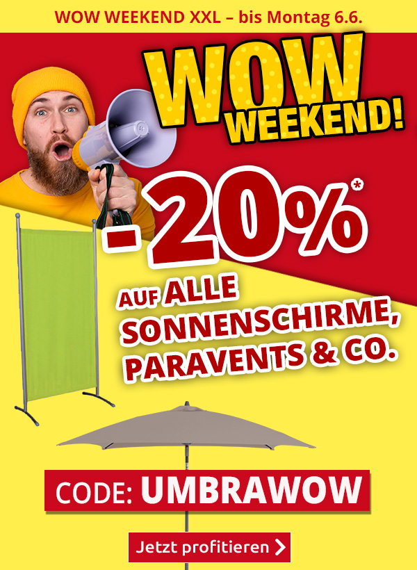 *Gültig nur bis zum 06.06.2022, einmal pro Person einlösbar: 20% Rabatt auf alle Artikel der Rubrik «Paravent, Sonnenschirm & Co. » im VEDIA Shop www.vedia.ch, inkl. reduzierter Artikel. Barablöse, Kontogutschrift oder eine Kombination mit anderen Aktionen ist nicht möglich. Versandkosten und Transportzuschläge sowie die Versicherungsgebühr sind vom Rabatt ausgeschlossen. Bitte Rabattcode UMBRAWOW bei der Bestellung eingeben. Kein Mindestbestellwert. Bei Retournierung oder Stornierung aller bestellten Artikel verfällt der Rabatt. Der Rabatt gilt nur für Online-Bestellungen auf www.vedia.ch.