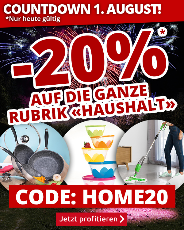 *Gültig nur am 27.07.2022, einmal pro Person einlösbar: 20% Rabatt auf alle Artikel der Rubrik «Haushalt» im VEDIA Shop, unter www.vedia.ch, inkl. reduzierter Artikel. Barablöse, Kontogutschrift oder eine Kombination mit anderen Aktionen ist nicht möglich. Versandkosten und Transportzuschläge sowie die Versicherungsgebühr sind vom Rabatt ausgeschlossen. Bitte Rabattcode HOME20 bei der Bestellung eingeben. Bei Retournierung oder Stornierung aller bestellten Artikel verfällt der Rabatt. Der Rabatt gilt nur für Online-Bestellungen auf www.vedia.ch.