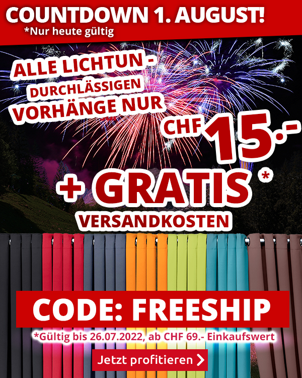 *Gültig nur am 26.07.2022, versandkostenfrei bestellen: Für die Auslieferung per Post entfällt der Versandkostenanteil von CHF 6.95 pro Bestellung (einmal pro Person einlösbar). Der Gratis-Versand gilt für alle Artikel im VEDIA Shop www.vedia.ch, inkl. reduzierter Artikel. Die Transportzuschläge für Möbel und andere Speditions-Artikel im Wert von CHF 19.95, CHF 49.95, CHF 99  bzw. CHF 129 sind vom Angebot ausgenommen und werden gegebenenfalls in Rechnung gestellt. Ebenfalls in Rechnung gestellt wird die Versicherungsprämie von CHF 0.90 bei Bestellungen unter CHF 110, bzw. darüber 0,8 % der Fakturasumme. Bei Retournierung oder Stornierung aller bestellten Artikel verfällt der Anspruch auf den Gratis-Versand. Der Gratis-Versand gilt nur für Online-Bestellungen auf www.vedia.ch. Der Mindestkaufwert (=Wert der behaltenen Ware und bezahlten Ware) beträgt CHF 69. Bitte Code FREESHIP bei der Bestellung eingeben.