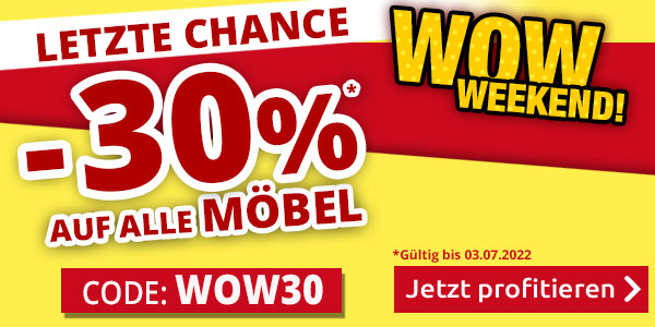 *Gültig nur vom 01.07.2022 bis 03.07.2022 : 30 % Rabatt auf alle Artikel der Rubrik «Möbel» im VEDIA Shop www.vedia.ch, inkl. reduzierter Artikel. Barablöse, Kontogutschrift oder eine Kombination mit anderen Aktionen ist nicht möglich. Versandkosten und Transportzuschläge sowie die Versicherungsgebühr sind vom Rabatt ausgeschlossen. Bitte Rabattcode WOW30 bei der Bestellung eingeben. Kein Mindestbestellwert. Bei Retournierung oder Stornierung aller bestellten Artikel verfällt der Rabatt. Der Rabatt gilt nur für Online-Bestellungen auf www.vedia.ch.