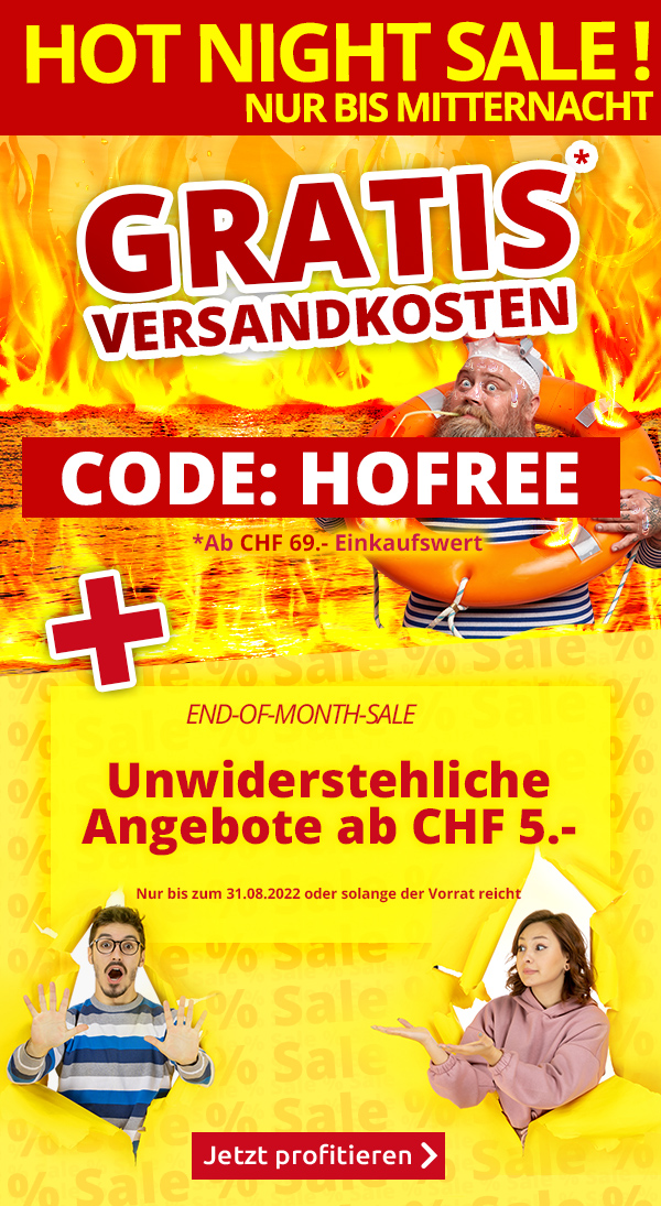 *Gültig nur bis zum 28.08.2022: Versandkostenanteil von CHF 6.95 entfällt. Transportzuschläge für sperrige Artikel, Möbel und andere Speditions-Artikel im Wert von CHF 19.95, CHF 49.95, CHF 99 bzw. CHF 129 sind vom Angebot ausgenommen. Bei Retournierung oder Stornierung aller bestellten Artikel verfällt der Anspruch. Angebot gilt nur für Onlinebestellungen auf www.vedia.ch. Der Mindestkaufwert (=Wert der behaltenen Ware und bezahlten Ware) beträgt CHF 69.-. Bitte Code HOFREE bei der Bestellung eingeben.