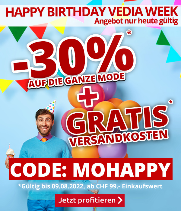 *Valable uniquement le 04.08.2022, toute commande passée est exempte de frais de livraison, les frais de CHF 6.95 par commande sont offerts (offre valable une seule fois, pour une seule personne). Les frais de livraison sont offerts pour tous les articles du site, y compris les articles à prix réduits. En revanche, les suppléments de transport concernant les meubles et autres articles lourds et volumineux, se montant respectivement à CHF 19.95, CHF 49.95, CHF 99.- et à CHF 129.- restent facturés. De même, la prime d’assurance, qui est de CHF 0.90 pour les commandes inférieures à CHF 110.- et qui correspond à 0,8% du montant de la facture pour les sommes supérieures, reste facturée. En cas de renvoi ou d'annulation de tous les articles commandés, l'offre sur les frais de livraison perd toute validité. La gratuité des frais de livraison n’est valable que pour les commandes passées par Internet sur www.vedia.ch. Le montant minimum d’achat (= la valeur totale de la marchandise conservée et payée) doit être de CHF 69. Merci d’indiquer le code FREEHOT lors de la commande.