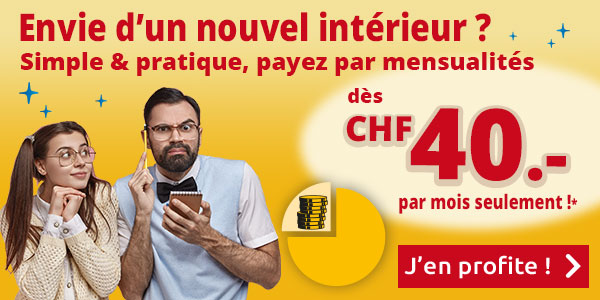 *Nous accordons un paiement partiel à partir d‘un achat de CHF 60.-. Pour les commandes de moins de CHF 500.-, chaque mensualité se monte à 10% du montant total de l‘achat, avec un minimum de CHF 40.- par versement. Les intérêts et frais de traitement sont mensuellement de 0.83% (annuellement de 10%) de la somme ouverte au crédit, avec un minimum de CHF 6.-. Voir toutes les conditions sur www.vedia.ch
