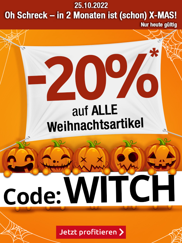 *Gültig nur am 25.10.2022, einmal pro Person einlösbar: 20 % Rabatt auf alle Artikel der Rubrik «Xmas» im VEDIA Shop www.vedia.ch, inkl. reduzierter Artikel. Barablöse, Kontogutschrift oder eine Kombination mit anderen Aktionen ist nicht möglich. Versandkosten und Transportzuschläge sowie die Versicherungsgebühr sind vom Rabatt ausgeschlossen. Bitte Rabattcode WITCH bei der Bestellung eingeben. Bei Retournierung oder Stornierung aller bestellten Artikel verfällt der Rabatt. Der Rabatt gilt nur für Online-Bestellungen auf www.vedia.ch.