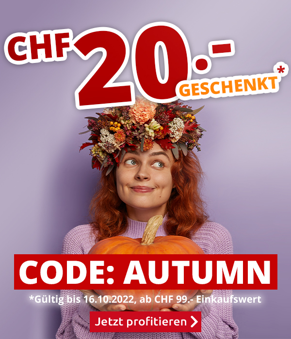 *Gültig bis 16.10.2022, einmal pro Person einlösbar: 20 CHF-Einkaufsgutschein für alle Artikel im VEDIA Shop www.vedia.ch, inkl. reduzierter Artikel. Barablöse, Kontogutschrift oder eine Kombination mit anderen Aktionen ist nicht möglich. Versandkosten und Transportzuschläge sowie die Versicherungsgebühr sind vom Gutschein ausgeschlossen. Bitte Gutscheincode AUTUMN bei der Bestellung eingeben. Der Mindestkaufwert (=Wert der behaltenen Ware und bezahlten Ware) beträgt CHF 99. Bei Retournierung oder Stornierung aller bestellten Artikel verfällt der Gutschein. Der Gutschein gilt nur für Online-Bestellungen auf www.vedia.ch.