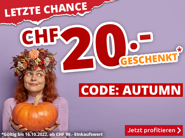 *Gültig bis 16.10.2022, einmal pro Person einlösbar: 20 CHF-Einkaufsgutschein für alle Artikel im VEDIA Shop www.vedia.ch, inkl. reduzierter Artikel. Barablöse, Kontogutschrift oder eine Kombination mit anderen Aktionen ist nicht möglich. Versandkosten und Transportzuschläge sowie die Versicherungsgebühr sind vom Gutschein ausgeschlossen. Bitte Gutscheincode AUTUMN bei der Bestellung eingeben. Der Mindestkaufwert (=Wert der behaltenen Ware und bezahlten Ware) beträgt CHF 99. Bei Retournierung oder Stornierung aller bestellten Artikel verfällt der Gutschein. Der Gutschein gilt nur für Online-Bestellungen auf www.vedia.ch.