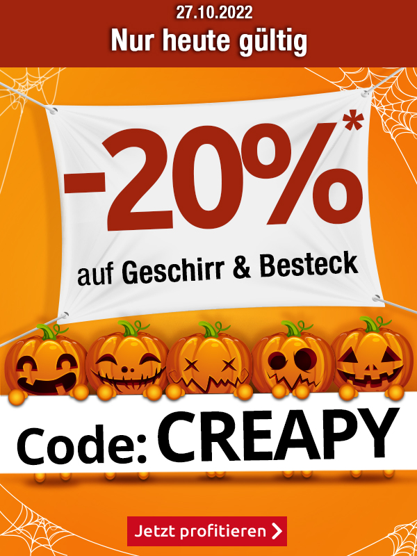 *Gültig nur am 27.10.2022, einmal pro Person einlösbar: 20 % Rabatt auf alle Artikel der Rubrik «Geschirr & Besteck» im VEDIA Shop www.vedia.ch, inkl. reduzierter Artikel. Barablöse, Kontogutschrift oder eine Kombination mit anderen Aktionen ist nicht möglich. Versandkosten und Transportzuschläge sowie die Versicherungsgebühr sind vom Rabatt ausgeschlossen. Bitte Rabattcode CREAPY bei der Bestellung eingeben. Bei Retournierung oder Stornierung aller bestellten Artikel verfällt der Rabatt. Der Rabatt gilt nur für Online-Bestellungen auf www.vedia.ch.