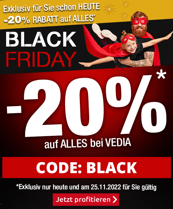 *Nur heute und morgen 24.11.2022 und 25.11.2022 gültig, einmal pro Person einlösbar: 20 % Rabatt auf alle Artikel im VEDIA Shop www.vedia.ch, inkl. reduzierter Artikel. Barablöse, Kontogutschrift oder eine Kombination mit anderen Aktionen ist nicht möglich. Versandkosten und Transportzuschläge sowie die Versicherungsgebühr sind vom Rabatt ausgeschlossen. Bitte Rabattcode BLACK bei der Bestellung eingeben. Bei Retournierung oder Stornierung aller bestellten Artikel verfällt der Rabatt. Der Rabatt gilt nur für Online-Bestellungen auf www.vedia.ch.