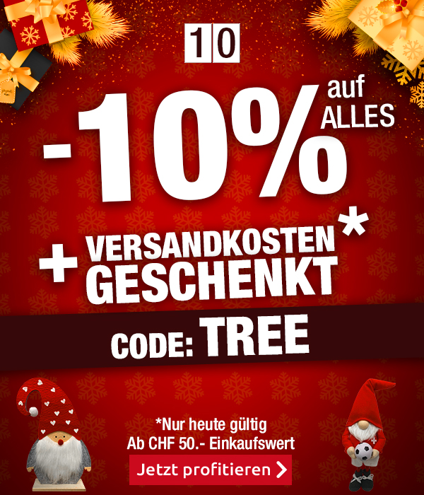 *Gültig nur am 10.12.2022: 10 % Rabatt auf alle Artikel im VEDIA Shop www.vedia.ch. Versandkostenanteil von CHF 6.95 entfällt. Haushalts-Grossgeräte und die Transportzuschläge für Möbel und andere Speditions-Artikel im Wert von CHF 19.95, CHF 79.95, CHF 99.- bzw. CHF 149.- sind vom Angebot ausgenommen und werden gegebenenfalls in Rechnung gestellt. Barablöse, Kontogutschrift oder Kombination mit anderen Aktionen ist nicht möglich. Bei Retournierung oder Stornierung aller bestellten Artikel verfällt der Anspruch. Angebot gilt nur für Onlinebestellungen auf www.vedia.ch. Der Mindestkaufwert (=Wert der behaltenen Ware und bezahlten Ware) beträgt CHF 50.-. Bitte Code TREE bei der Bestellung eingeben.