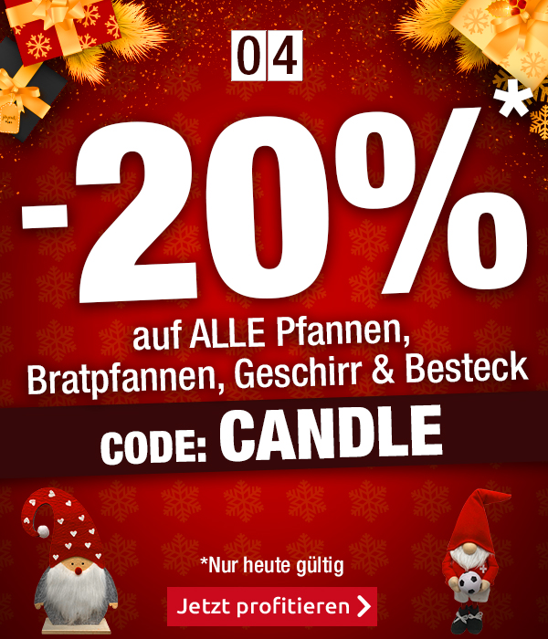 *Gültig am 04.12.2022: 20 % Rabatt auf alle Artikel die Rubriken «Geschirr & Besteck» und «Pfannen & Bratpfannen» auf www.vedia.ch. Barablöse, Kontogutschrift oder Kombination mit anderen Aktionen ist nicht möglich. Bei Retournierung oder Stornierung aller bestellten Artikel verfällt der Rabatt. Versandkosten und Transportzuschläge sowie die Versicherungsgebühr sind vom Rabatt ausgeschlossen. Bitte Rabattcode CANDLE bei der Bestellung eingeben. Rabatt gilt nur für Onlinebestellungen auf www.vedia.ch.