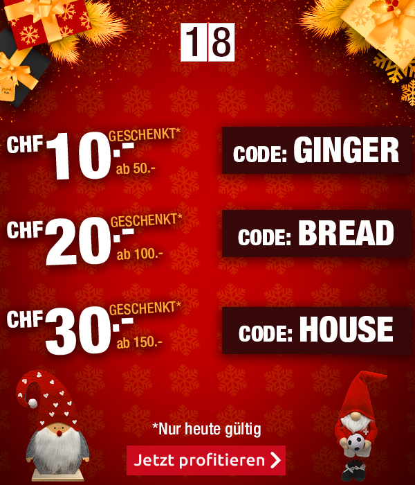 *Gültig am 18.12.2022. Die Einkaufsgutscheine gelten für alle Artikel im VEDIA Online-Shop www.vedia.ch, inkl. reduzierter Artikel. Barablöse, Kontogutschrift oder Kombination mit anderen Aktionen ist nicht möglich. Versandkosten und Transportzuschläge sowie die Versicherungsgebühr sind vom Gutschein ausgeschlossen. Bei der Bestellung geben Sie bitte an: Gutscheincode GINGER für den Gutschein im Wert von CHF 10.-, BREAD für den Gutschein im Wert von CHF 20.- und HOUSE für den Gutschein im Wert von CHF 30.-. Die Mindestkaufwerte (=Wert der behaltenen Ware und bezahlten Ware) betragen: CHF 50.- für den CHF 10.- Gutschein, CHF 100.- für den CHF 20.- Gutschein und CHF 150.- für den CHF 30.- Gutschein. Bei Retournierung oder Stornierung aller bestellten Artikel verfallen die Gutscheine. Die Gutscheine gelten nur für Onlinebestellungen auf www.vedia.ch.