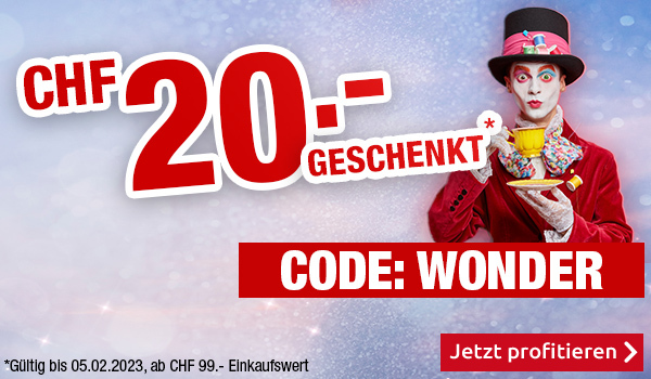 *Gültig nur bis zum 05.02.2023. Barablöse, Kontogutschrift oder Kombination mit anderen Aktionen ist nicht möglich. Der Mindestkaufwert (=Wert der behaltenen Ware und bezahlten Ware) beträgt CHF 99.-. Bei Retournierung oder Stornierung aller bestellten Artikel verfällt der Gutschein. Der Einkaufsgutschein gilt für alle Artikel im VEDIA Online-Shop, inkl. reduzierter Artikel. Versandkosten und Transportzuschläge sowie die Versicherungsgebühr sind vom Gutschein ausgeschlossen. Bitte Gutscheincode WONDER bei der Bestellung eingeben. Der Gutschein gilt nur für Onlinebestellungen auf www.vedia.ch.
