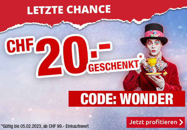 *Gültig nur bis zum 05.02.2023. Barablöse, Kontogutschrift oder Kombination mit anderen Aktionen ist nicht möglich. Der Mindestkaufwert (=Wert der behaltenen Ware und bezahlten Ware) beträgt CHF 99.-. Bei Retournierung oder Stornierung aller bestellten Artikel verfällt der Gutschein. Der Einkaufsgutschein gilt für alle Artikel im VEDIA Online-Shop, inkl. reduzierter Artikel. Versandkosten und Transportzuschläge sowie die Versicherungsgebühr sind vom Gutschein ausgeschlossen. Bitte Gutscheincode WONDER bei der Bestellung eingeben. Der Gutschein gilt nur für Onlinebestellungen auf www.vedia.ch.