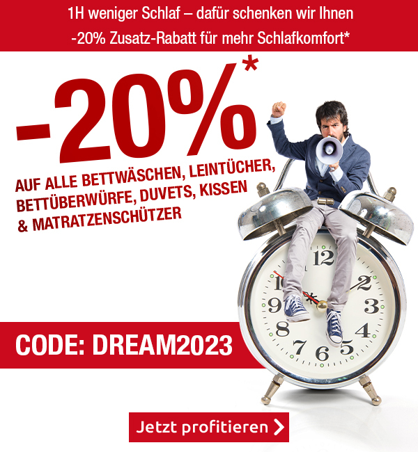 *Gültig am 26.03.2023: 20 % Rabatt auf alle Artikel der Rubrik «Bettwäsche», «Duvets, Kissen & Matratzenschutz», «Leintücher» und «Bettüberwurf» auf www.vedia.ch. Barablöse, Kontogutschrift oder Kombination mit anderen Aktionen ist nicht möglich. Bei Retournierung oder Stornierung aller bestellten Artikel verfällt der Rabatt. Versandkosten und Transportzuschläge sowie die Versicherungsgebühr sind vom Rabatt ausgeschlossen. Bitte Rabattcode DREAM2023 bei der Bestellung eingeben. Rabatt gilt nur für Onlinebestellungen auf www.vedia.ch.