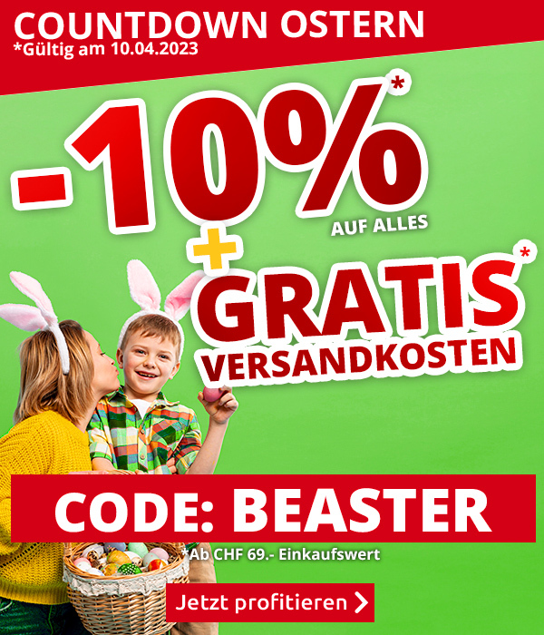 *Gültig am 10.04.2023: 10% Rabatt auf alle Artikel im VEDIA Shop www.vedia.ch. Versandkostenanteil von CHF 6.95 entfällt. Haushalts-Grossgeräte und die Transportzuschläge für Möbel und andere Speditions-Artikel im Wert von CHF 19.95, CHF 79.95, CHF 99.- bzw. CHF 149.- sind vom Angebot ausgenommen und werden gegebenenfalls in Rechnung gestellt. Barablöse, Kontogutschrift oder Kombination mit anderen Aktionen ist nicht möglich. Bei Retournierung oder Stornierung aller bestellten Artikel verfällt das Angebot. Das Angebot gilt nur für Onlinebestellungen auf www.vedia.ch. Der Mindestkaufwert (=Wert der behaltenen Ware und bezahlten Ware) beträgt CHF 69.-. Bitte Code BEASTER bei der Bestellung eingeben.