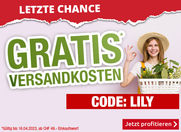 *Gültig nur bis zum 16.04.2023: Versandkostenanteil von CHF 6.95 entfällt (einmal pro Person einlösbar). Transportzuschläge für sperrige Artikel, Möbel und andere Speditions-Artikel im Wert von CHF 19.95, CHF 79.95, CHF 99.-  bzw. CHF 149.- sind vom Angebot ausgenommen. Bei Retournierung oder Stornierung aller bestellten Artikel verfällt der Anspruch. Angebot gilt nur für Onlinebestellungen auf www.vedia.ch. Der Mindestkaufwert (=Wert der behaltenen Ware und bezahlten Ware) beträgt CHF 49.-. Bitte Code LILY bei der Bestellung eingeben.