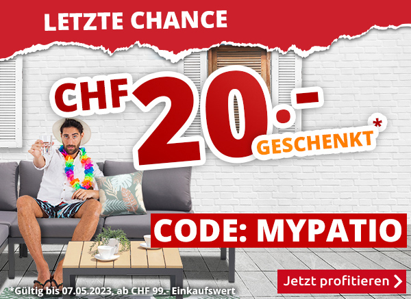 *Gültig nur bis zum 07.05.2023, einmal pro Person. CHF 20.- Einkaufsgutschein für alle Artikel im VEDIA Online-Shop www.vedia.ch, inkl. reduzierter Artikel. Der Mindestkaufwert (=Wert der behaltenen und bezahlten Ware) beträgt CHF 99.-. Bei Retournierung oder Stornierung aller bestellten Artikel verfällt der Gutschein. Versandkosten und Transportzuschläge sowie die Versicherungsgebühr sind vom Angebot ausgeschlossen. Bitte Code MYPATIO bei der Bestellung eingeben. Nur gültig für Onlinebestellungen auf www.vedia.ch