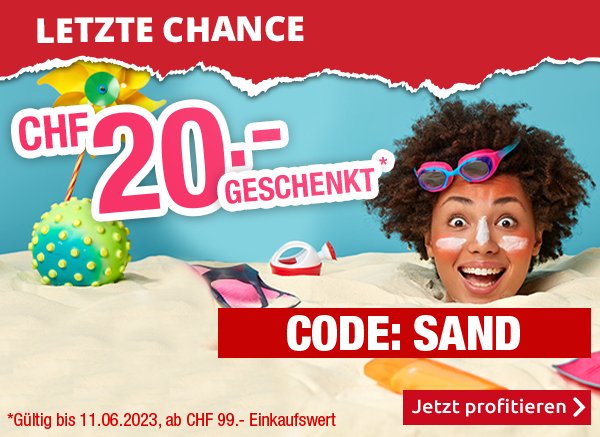 *Gültig bis 11.06.2023 (einmal pro Person einlösbar). 20.- CHF-Einkaufsgutschein für alle Artikel im VEDIA Shop www.vedia.ch. Barablöse, Kontogutschrift oder Kombination mit anderen Aktionen ist nicht möglich. Der Mindestkaufwert (=Wert der behaltenen Ware und bezahlten Ware) beträgt CHF 99.-. Bei Retournierung oder Stornierung aller bestellten Artikel verfällt der Gutschein. Der Einkaufsgutschein gilt für alle Artikel im VEDIA Online-Shop, inkl. reduzierter Artikel. Versandkosten und Transportzuschläge sowie die Versicherungsgebühr sind vom Gutschein ausgeschlossen. Bitte Gutscheincode SAND bei der Bestellung eingeben.