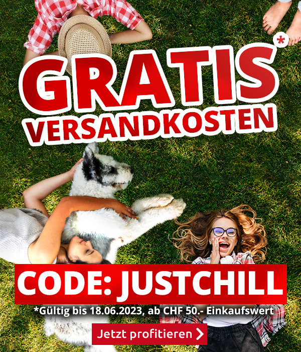 *Gültig nur bis zum 18.06.2023: Versandkostenanteil von CHF 6.95 entfällt. Transportzuschläge für sperrige Artikel, Möbel und andere Speditions-Artikel im Wert von CHF 19.95, CHF 79.95, CHF 99.-  bzw. CHF 149.- sind vom Angebot ausgenommen. Bei Retournierung oder Stornierung aller bestellten Artikel verfällt der Anspruch. Angebot gilt nur für Onlinebestellungen auf www.kays.ch. Der Mindestkaufwert (=Wert der behaltenen Ware und bezahlten Ware) beträgt CHF 50.-. Bitte Code JUSTCHILL bei der Bestellung eingeben.