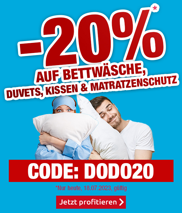 *Gültig am 18.07.2023: 20 % Rabatt auf alle Artikel die Rubriken «Duvets, Kissen & Matratzenschutz», «Bettwäsche» und «Bettwäsche Kinder & Jugend» auf www.vedia.ch. Barablöse, Kontogutschrift oder Kombination mit anderen Aktionen ist nicht möglich. Bei Retournierung oder Stornierung aller bestellten Artikel verfällt der Rabatt. Versandkosten und Transportzuschläge sowie die Versicherungsgebühr sind vom Rabatt ausgeschlossen. Bitte Rabattcode DODO20 bei der Bestellung eingeben. Rabatt gilt nur für Onlinebestellungen auf www.vedia.ch.