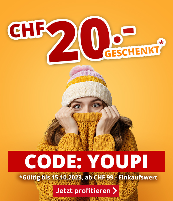 *Gültig nur bis zum 15.10.2023, einmal pro Person. CHF 20.- Einkaufsgutschein für alle Artikel im VEDIA Online-Shop www.vedia.ch, inkl. reduzierter Artikel. Der Mindestkaufwert (=Wert der behaltenen und bezahlten Ware) beträgt CHF 99.-. Bei Retournierung oder Stornierung aller bestellten Artikel verfällt der Gutschein. Versandkosten und Transportzuschläge sowie die Versicherungsgebühr sind vom Angebot ausgeschlossen. Bitte Code YOUPI bei der Bestellung eingeben. Nur gültig für Onlinebestellungen auf www.vedia.ch
