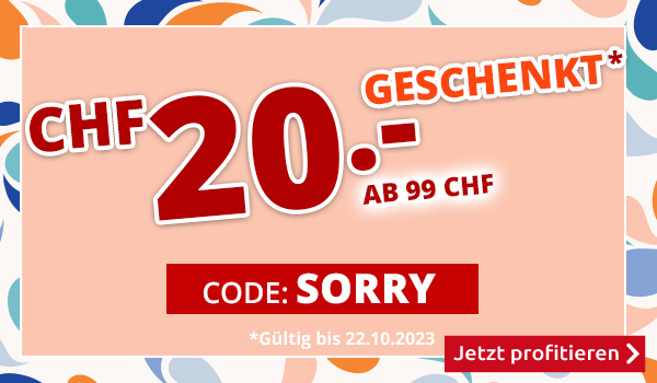 *Gültig nur bis zum 22.10.2023: Barablöse, Kontogutschrift oder Kombination mit anderen Aktionen ist nicht möglich (einmal pro Person einlösbar). 20.- CHF-Einkaufsgutschein für alle Artikel im VEDIA Shop www.vedia.ch. Der Mindestkaufwert (=Wert der behaltenen Ware und bezahlten Ware) beträgt CHF 99.-. Bei Retournierung oder Stornierung aller bestellten Artikel verfällt der Gutschein. Der Einkaufsgutschein gilt für alle Artikel im VEDIA Online-Shop, inkl. reduzierter Artikel. Versandkosten und Transportzuschläge sowie die Versicherungsgebühr sind vom Gutschein ausgeschlossen. Bitte Gutscheincode SORRY bei der Bestellung eingeben.