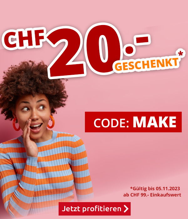 *Gültig nur bis zum 05.11.2023, einmal pro Person. CHF 20.- Einkaufsgutschein für alle Artikel im VEDIA Online-Shop www.vedia.ch, inkl. reduzierter Artikel. Der Mindestkaufwert (=Wert der behaltenen und bezahlten Ware) beträgt CHF 99.-. Bei Retournierung oder Stornierung aller bestellten Artikel verfällt der Gutschein. Versandkosten und Transportzuschläge sowie die Versicherungsgebühr sind vom Angebot ausgeschlossen. Bitte Code MAKE bei der Bestellung eingeben. Nur gültig für Onlinebestellungen auf www.vedia.ch