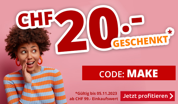 *Gültig nur bis zum 05.11.2023, einmal pro Person. CHF 20.- Einkaufsgutschein für alle Artikel im VEDIA Online-Shop www.vedia.ch, inkl. reduzierter Artikel. Der Mindestkaufwert (=Wert der behaltenen und bezahlten Ware) beträgt CHF 99.-. Bei Retournierung oder Stornierung aller bestellten Artikel verfällt der Gutschein. Versandkosten und Transportzuschläge sowie die Versicherungsgebühr sind vom Angebot ausgeschlossen. Bitte Code MAKE bei der Bestellung eingeben. Nur gültig für Onlinebestellungen auf www.vedia.ch