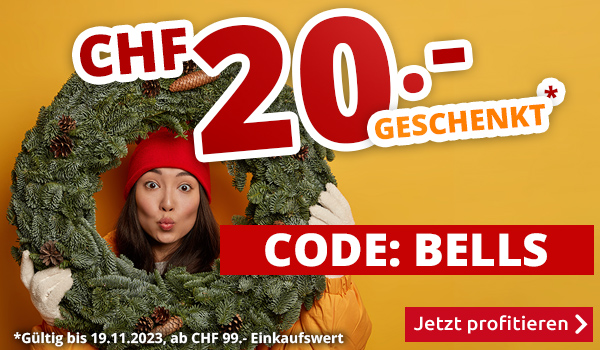 *Gültig nur bis zum 19.11.2023, CHF 20.- Einkaufsgutschein für alle Artikel im VEDIA Shop www.vedia.ch, Versandkostenanteil von CHF 6.95 entfällt. Der Mindestkaufwert (=Wert der behaltenen Ware und bezahlten Ware) beträgt CHF 99.-. Bei Retournierung oder Stornierung aller bestellten Artikel verfällt der Gutschein. Der Einkaufsgutschein gilt für alle Artikel im VEDIA Online-Shop, inkl. reduzierter Artikel. Versandkosten und Transportzuschläge sowie die Versicherungsgebühr sind vom Gutschein ausgeschlossen. Bitte Gutscheincode BELLS bei der Bestellung eingeben. Der Gutschein gilt nur für Onlinebestellungen auf www.vedia.ch.
