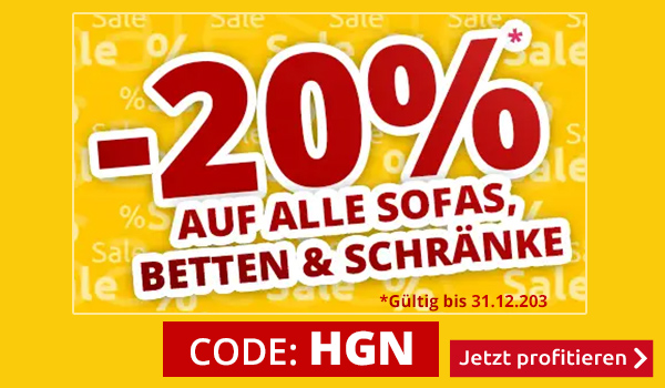 *Gültig nur bis zum 31.12.2023: 20% Rabatt auf alle Artikel der Rubriken «Sofas», «Betten & Boxspringbetten» und «Schränke» im VEDIA Shop www.vedia.ch, inkl. reduzierter Artikel. Barablöse, Kontogutschrift oder eine Kombination mit anderen Aktionen ist nicht möglich. Versandkosten und Transportzuschläge sowie die Versicherungsgebühr sind vom Rabatt ausgeschlossen. Bitte Rabattcode HGN bei der Bestellung eingeben. Bei Retournierung oder Stornierung aller bestellten Artikel verfällt der Rabatt. Der Rabatt gilt nur für Online-Bestellungen auf www.vedia.ch.