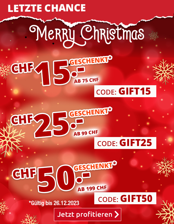 *Gültig nur bis zum 26.12.2023. Die Einkaufsgutscheine gelten für alle Artikel im VEDIA Online-Shop www.vedia.ch, inkl. reduzierter Artikel. Barablöse, Kontogutschrift oder Kombination mit anderen Aktionen ist nicht möglich. Versandkosten und Transportzuschläge sowie die Versicherungsgebühr sind vom Gutschein ausgeschlossen. Bei der Bestellung geben Sie bitte an: Gutscheincode GIFT15 für den Gutschein im Wert von CHF 15.-, GIFT25 für den Gutschein im Wert von CHF 25.- und GIFT50 für den Gutschein im Wert von CHF 50.-. Die Mindestkaufwerte (=Wert der behaltenen Ware und bezahlten Ware) betragen: CHF 75.- für den CHF 15.- Gutschein, CHF99.- für den CHF 25.- Gutschein und CHF 199.- für den CHF 50.- Gutschein. Bei Retournierung oder Stornierung aller bestellten Artikel verfallen die Gutscheine. Die Gutscheine gelten nur für Onlinebestellungen auf www.vedia.ch.