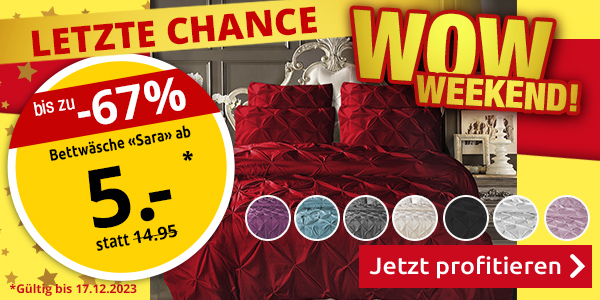 LETZTE CHANCE um vom WOW-Weekend zu profitieren! +++ Türchen N°17: -50% auf ALLE Weihnachtsartikel! Sollte diese E-Mail nicht korrekt angezeigt werden, sehen Sie sich hier die Online-Version an. |