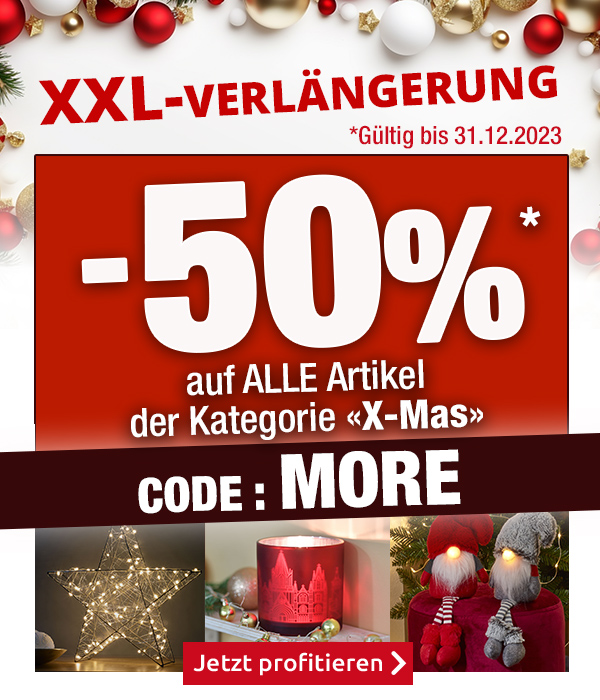 Gültig nur bis zum 31.12.2023: 50 % Rabatt auf alle Artikel der Rubrik «Weihnachten» auf www.vedia.ch. Barablöse, Kontogutschrift oder Kombination mit anderen Aktionen ist nicht möglich. Bei Retournierung oder Stornierung aller bestellten Artikel verfällt der Rabatt. Versandkosten und Transportzuschläge sowie die Versicherungsgebühr sind vom Rabatt ausgeschlossen. Bitte Rabattcode MORE bei der Bestellung eingeben. Rabatt gilt nur für Onlinebestellungen auf www.vedia.ch.