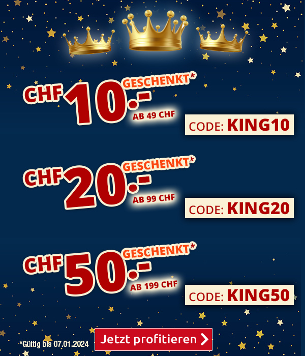 CHF 10.- | CHF 20.- | CHF 50.- GESCHENKT mit Codes KING10 | KING20 | KING50