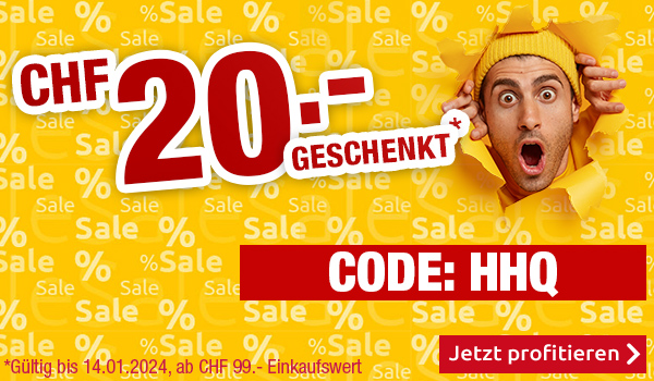 *Gültig bis 14.01.2024. Barablöse, Kontogutschrift oder Kombination mit anderen Aktionen ist nicht möglich. Der Mindestkaufwert (=Wert der behaltenen Ware und bezahlten Ware) beträgt CHF 99.-. Bei Retournierung oder Stornierung aller bestellten Artikel verfällt der Gutschein. Der Einkaufsgutschein gilt für alle Artikel im VEDIA Online-Shop, inkl. reduzierter Artikel. Versandkosten und Transportzuschläge sowie die Versicherungsgebühr sind vom Gutschein ausgeschlossen. Bitte Gutscheincode HHQ bei der Bestellung eingeben. Der Gutschein gilt nur für Onlinebestellungen auf www.vedia.ch.