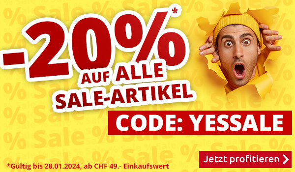 *Gültig nur bis zum 28.01.2024: 20% Rabatt auf alle Artikel aus der Rubrik «Sale» auf www.vedia.ch. Barablöse, Kontogutschrift oder Kombination mit anderen Aktionen sind nicht möglich. Bei Retournierung oder Stornierung aller bestellten Artikel verfällt der Rabatt. Versandkosten und Transportzuschläge sowie die Versicherungsgebühr sind vom Rabatt ausgeschlossen. Die Marken NOMLILO & eldur sind ausgenommen. Haushalts-Grossgeräte sind ausgenommen. Der Mindestkaufwert (=Wert der behaltenen Ware und bezahlten Ware) beträgt CHF 49.-. Bitte Rabattcode YESSALE bei der Bestellung eingeben. Rabatt gilt nur für Onlinebestellungen auf www.vedia.ch.