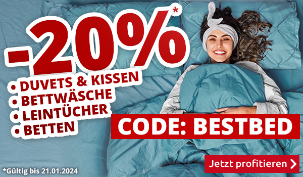 *Gültig nur bis zum 21.01.2024: 20% Rabatt auf alle Artikel aus den Rubriken «Betten & Boxspringbetten», «Bettwäsche», «Leintücher, Matratzenschutz & Bettüberwürfe» und «Duvets & Kissen» auf www.vedia.ch. Barablöse, Kontogutschrift oder Kombination mit anderen Aktionen ist nicht möglich. Bei Retournierung oder Stornierung aller bestellten Artikel verfällt der Rabatt. Versandkosten und Transportzuschläge sowie die Versicherungsgebühr sind vom Rabatt ausgeschlossen. Bitte Rabattcode BESTBED bei der Bestellung eingeben. Rabatt gilt nur für Onlinebestellungen auf www.vedia.ch.
