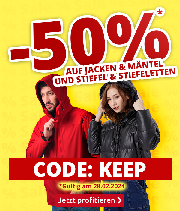 *Gültig am 28.02.2024: 50% Rabatt auf alle Artikel aus der Rubrik «Jacken & Mäntel» und «Stiefel & Stiefeletten» auf www.vedia.ch. Barablöse, Kontogutschrift oder Kombination mit anderen Aktionen sind nicht möglich. Bei Retournierung oder Stornierung aller bestellten Artikel verfällt der Rabatt. Versandkosten und Transportzuschläge sowie die Versicherungsgebühr sind vom Rabatt ausgeschlossen. Bitte Rabattcode KEEP bei der Bestellung eingeben. Rabatt gilt nur für Onlinebestellungen auf www.vedia.ch.