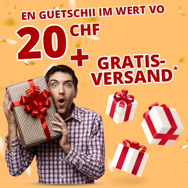 *Gültig innerhalb der nächsten 30 Tage, nur einmal pro Person, 20 CHF-Einkaufsgutschein für alle Artikel im VEDIA Shop www.vedia.ch. Versandkostenanteil von CHF 6.95 entfällt. Transportzuschläge für sperrige Artikel, Möbel und andere Speditions-Artikel im Wert von CHF 19.95, CHF 79.95, CHF 99.- bzw. CHF 149.- sind vom Angebot ausgenommen. Barablöse, Kontogutschrift oder Kombination mit anderen Aktionen ist nicht möglich. Bei Retournierung oder Stornierung aller bestellten Artikel verfällt der Anspruch. Angebot gilt nur für Onlinebestellungen auf www.vedia.ch. Der Mindestkaufwert (=Wert der behaltenen Ware und bezahlten Ware) beträgt 99 CHF. Bitte Code BEM bei der Bestellung eingeben.