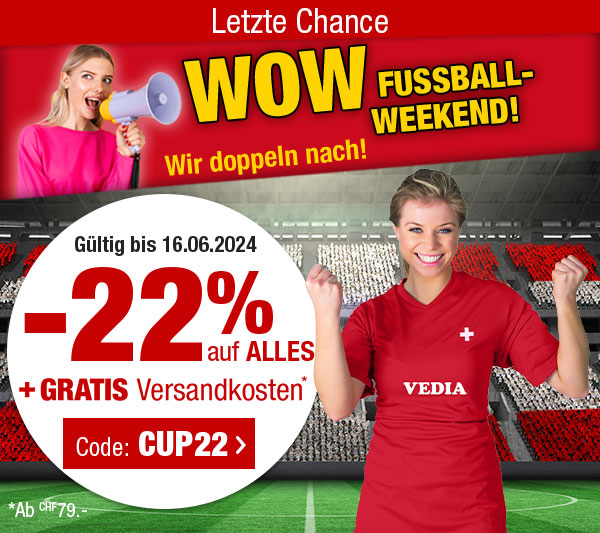 *Gültig bis 16.06.2024: 22% Rabatt auf alle Artikel auf www.vedia.ch, Versandkostenanteil von CHF 6.95 entfällt. Die Transportzuschläge für Möbel und andere Speditions-Artikel (CHF 19.95, CHF 79.95, CHF 99.- bzw. CHF 149.-) sowie die Versicherungsgebühr sind vom Angebot ausgeschlossen. Haushalts-Grossgeräte sind vom Rabatt ausgeschlossen.Barablöse, Kontogutschrift oder Kombination mit anderen Aktionen ist nicht möglich. Bei Retournierung oder Stornierung aller bestellten Artikel verfällt der Anspruch. Angebot gilt nur für Onlinebestellungen auf www.vedia.ch. Der Mindestkaufwert (=Wert der behaltenen Ware und bezahlten Ware) beträgt CHF 79.-. Bitte Code CUP22 bei der Bestellung eingeben.