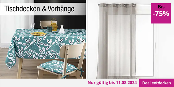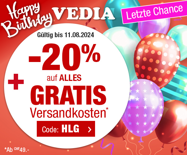 *Gültig nur bis zum 11.08.2024: 20 % Rabatt auf alle Artikel im VEDIA Shop www.vedia.ch. Versandkostenanteil von CHF 6.95 entfällt. Haushalts-Grossgeräte und die Transportzuschläge für Möbel und andere Speditions-Artikel im Wert von CHF 19.95, CHF 79.95, CHF 99.-  bzw. CHF 149.- sind vom Angebot ausgenommen und werden gegebenenfalls in Rechnung gestellt. Barablöse, Kontogutschrift oder Kombination mit anderen Aktionen ist nicht möglich. Bei Retournierung oder Stornierung aller bestellten Artikel verfällt der Anspruch. Angebot gilt nur für Onlinebestellungen auf www.vedia.ch. Der Mindestkaufwert (=Wert der behaltenen Ware und bezahlten Ware) beträgt CHF 49.-. Bitte Code HLG bei der Bestellung eingeben.