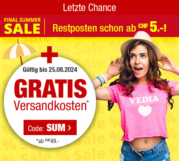 *Gültig nur bis zum 25.08.2024: Versandkostenanteil von CHF 6.95 entfällt. Transportzuschläge für sperrige Artikel, Möbel und andere Speditions-Artikel im Wert von CHF 19.95, CHF 79.95, CHF 99.-  bzw. CHF 149.- sind vom Angebot ausgenommen. Bei Retournierung oder Stornierung aller bestellten Artikel verfällt der Anspruch. Angebot gilt nur für Onlinebestellungen auf www.vedia.ch. Der Mindestkaufwert (=Wert der behaltenen Ware und bezahlten Ware) beträgt CHF 49.-. Bitte Code SUM bei der Bestellung eingeben.